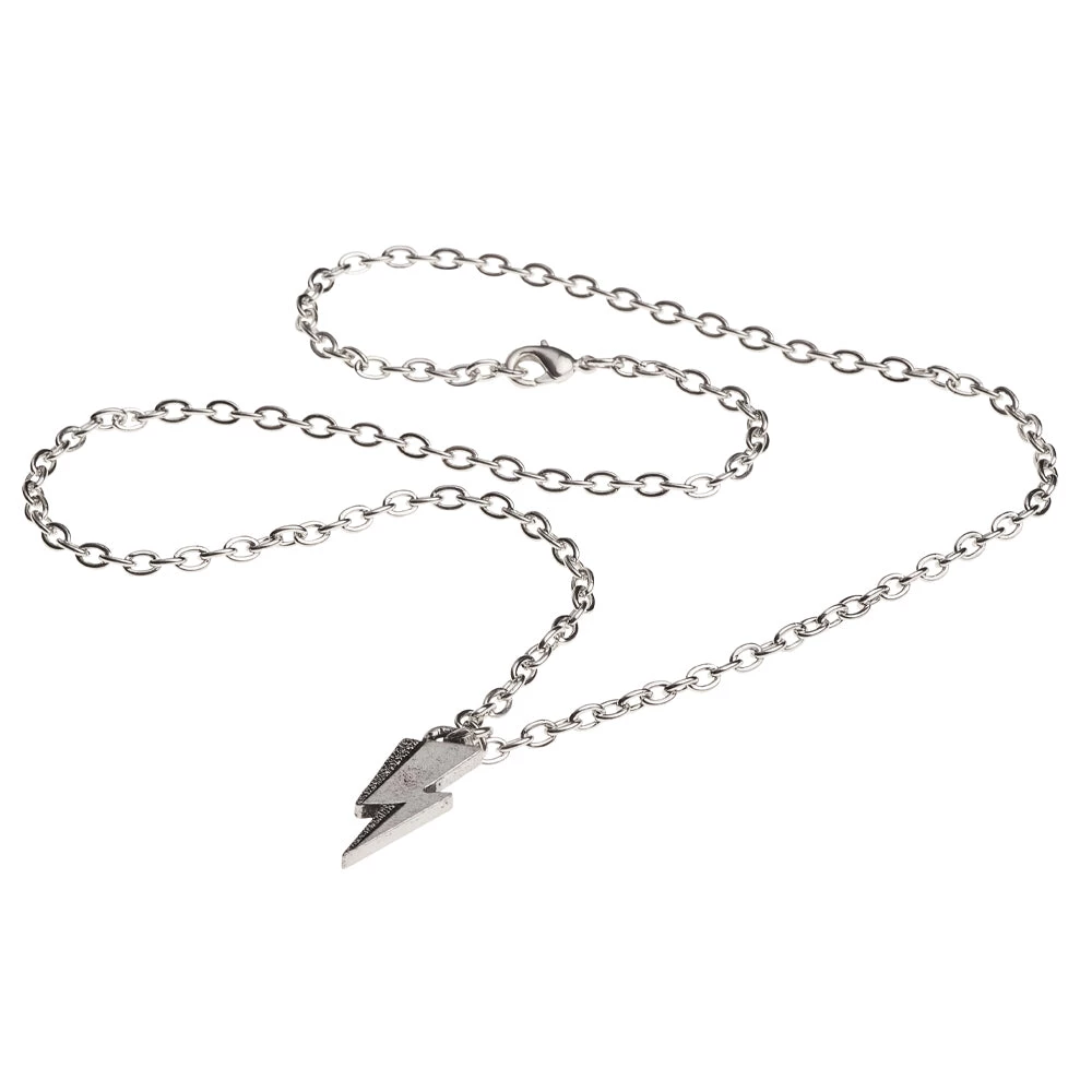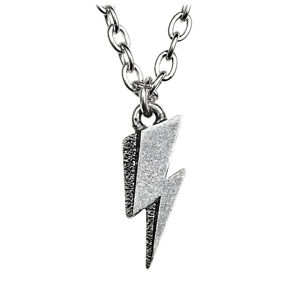 Lightning bolt logo design based-on Bowie’s early 1970s aesthetic. An antiqued English pewter pendant on 21″ trace chain.