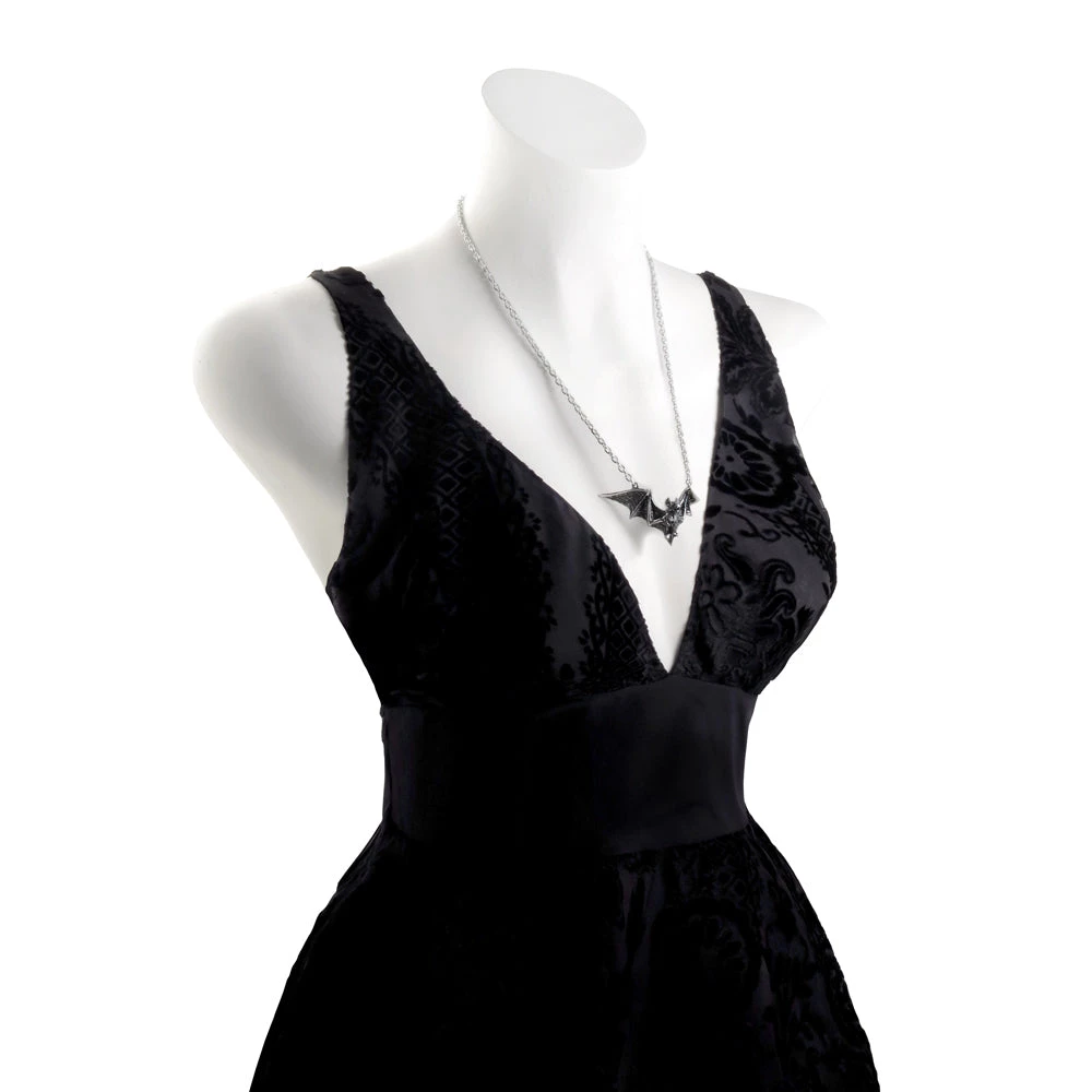 A Vampire bat of Balkan severity and proportions. A substantially-sized piece of classic gothic jewelry. A pewter modeled flying bat with raised and outstretched wings.