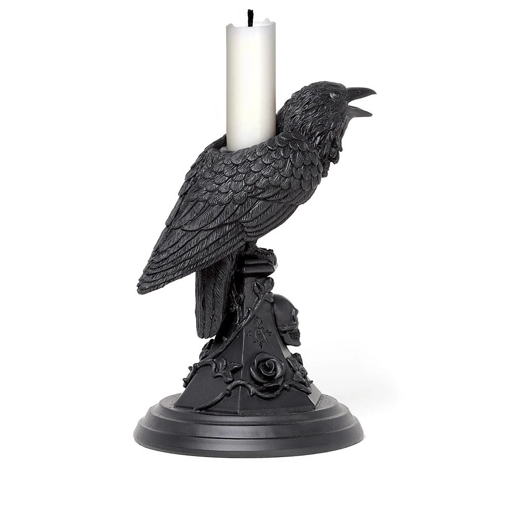 A raven, rose and skull design candle stick hand finished in the finest quality black resin.