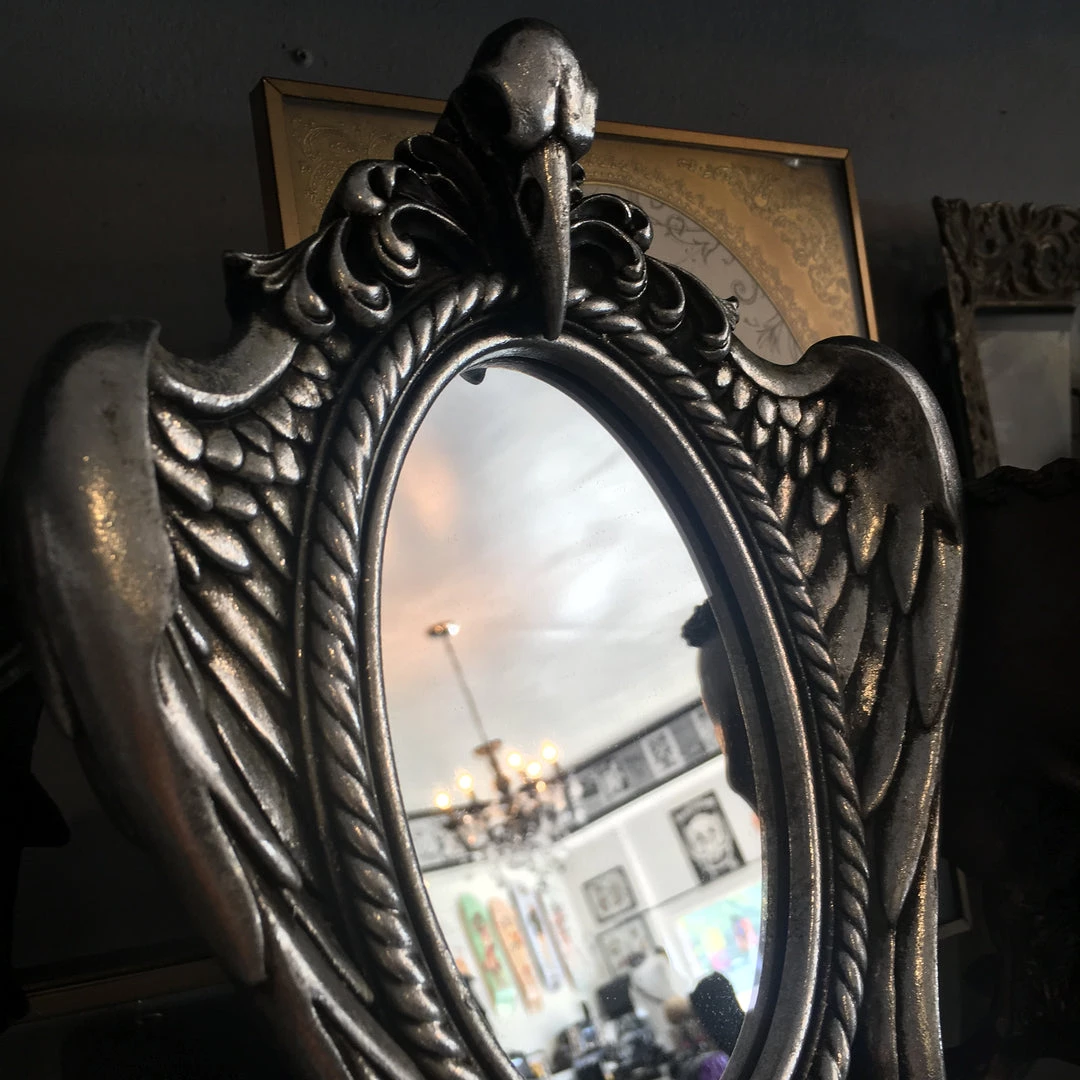 A spirit raven takes flight to guide a forlorn lover’s desperate search for hope after the tragic loss of his beloved. Beautiful ornate filigree frame with raven skull on top.