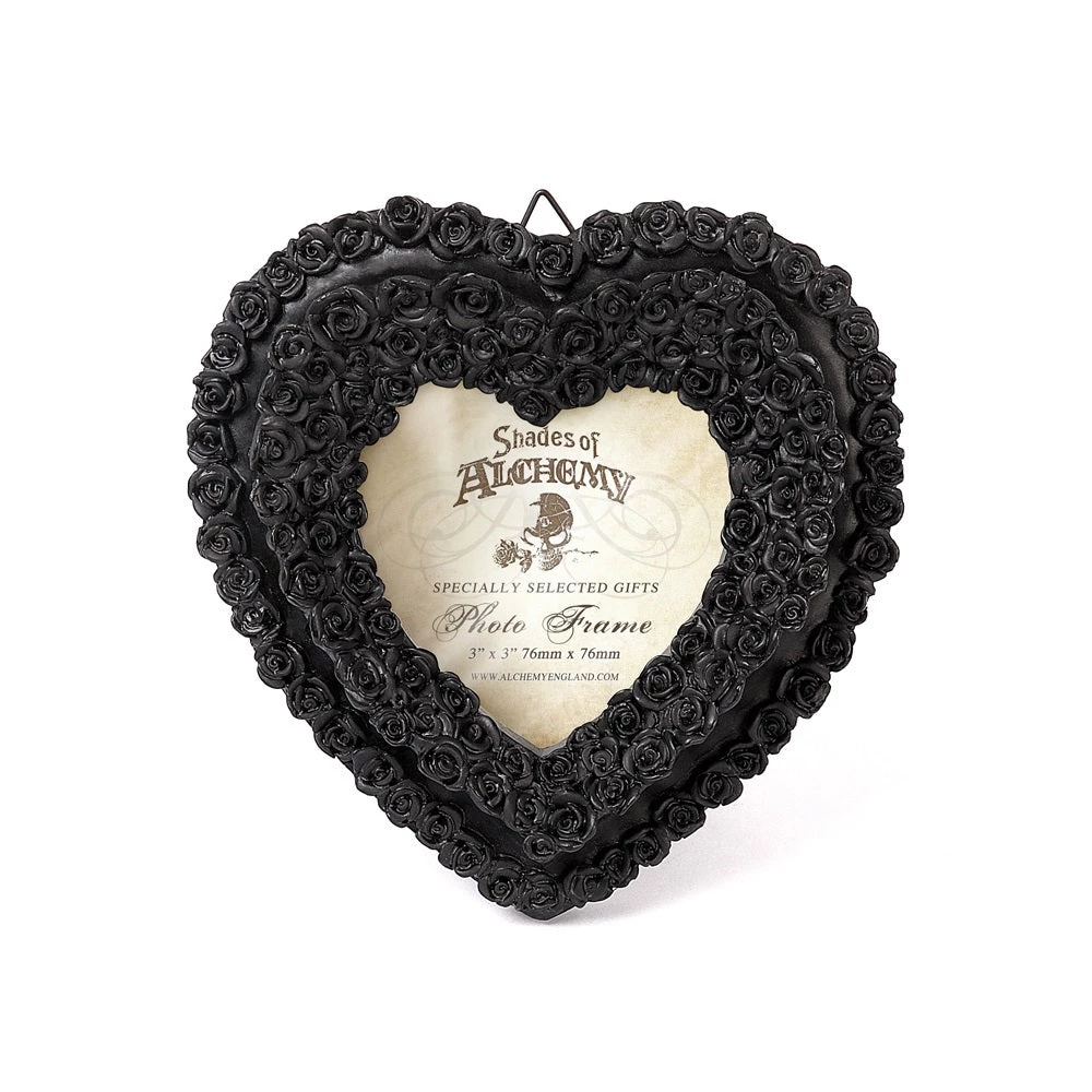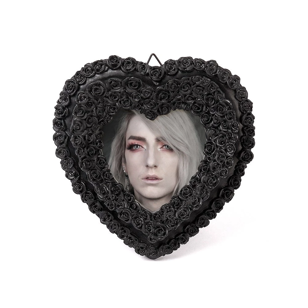Tiny black roses form a heart shape to display a photo of your loved one.