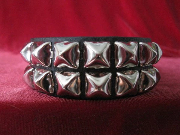 Two row pyramid wristband on black leather with bright nickel 1/2″ pyramids.1.75″ wide.