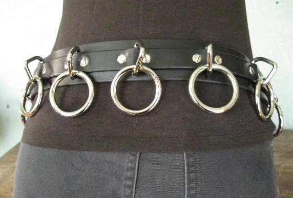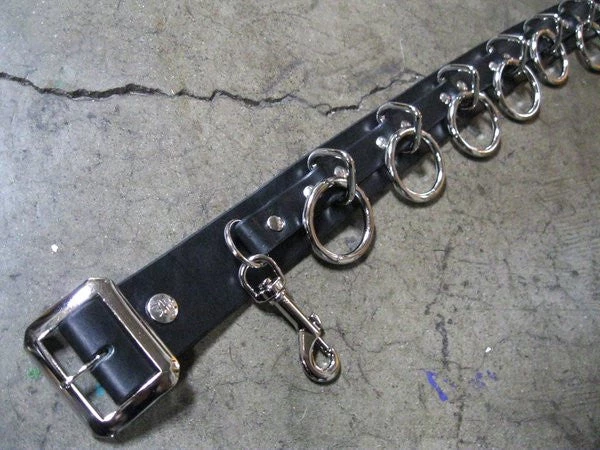 High Quality Leather Belt. 1.75″ Wide, with nine large cast & chromed bondage ring setups.