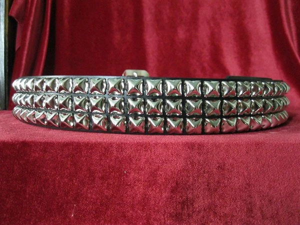 - High quality leather belt with 3 rows of chrome pyramid studs. 1.75″ wide.