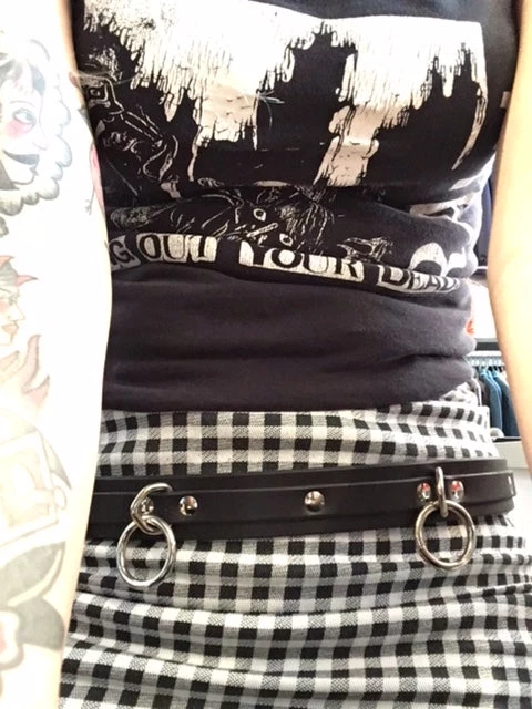 High Quality Leather Belt. 1.75″ Wide, with five small cast & chromed bondage ring setups.