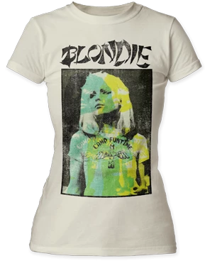 Hang on the telephone with this rad new Blondie tee. This super soft, ladies fitted, vintage-white, cotton tee features a frontal graphic, with a crew neck style neckline