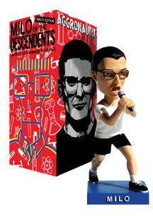 Milo, the charismatic frontman of The Descendents, is now available in MINIÂ Bobble head form. This little fella is limited to 2500 numbered units, stands at 5 inches tall, and is made of a lightweight polyresin. Displayed on a full color box, here Milo is accurately sculpted right down to the nerdy glasses and bitchin’ stage stance. Thou shalt not be without aforementioned Throbblehead… ALL!