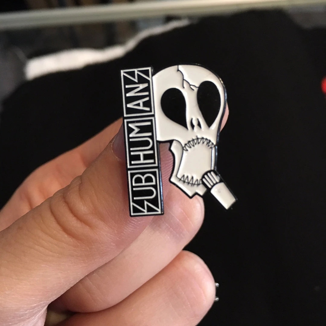 High quality enamel lapel pin that features Subhumans skull logo, black with white with lettering.