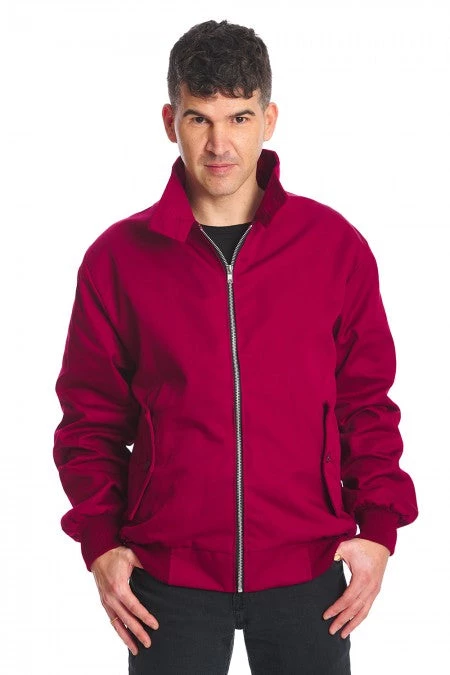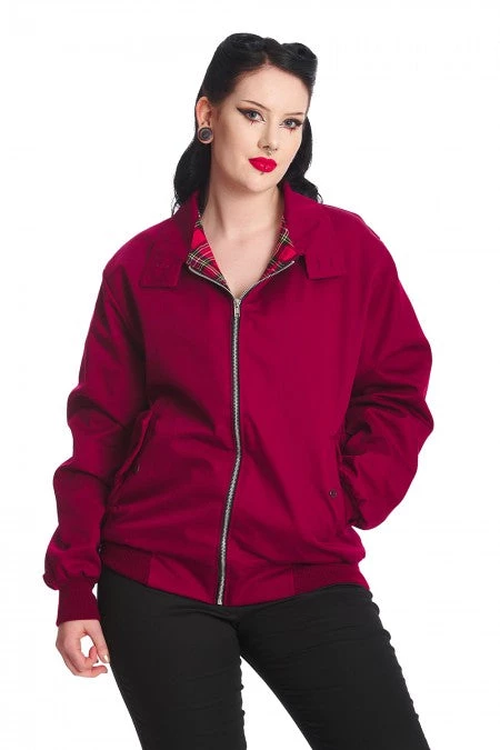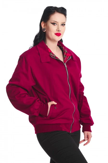 This rad, lightweight Harrington jacket features a red plaid (tartan) lining, side button close pockets and a zip up front.