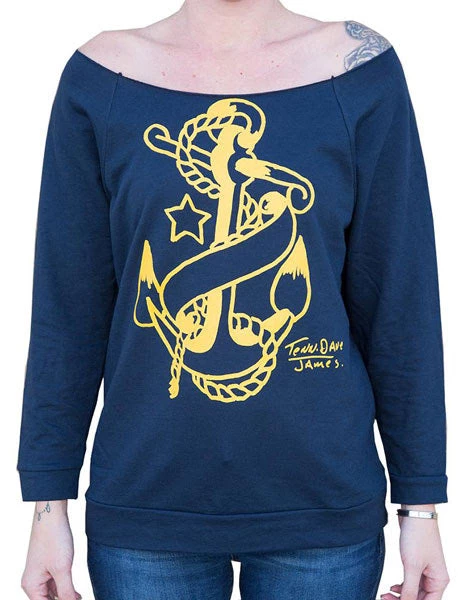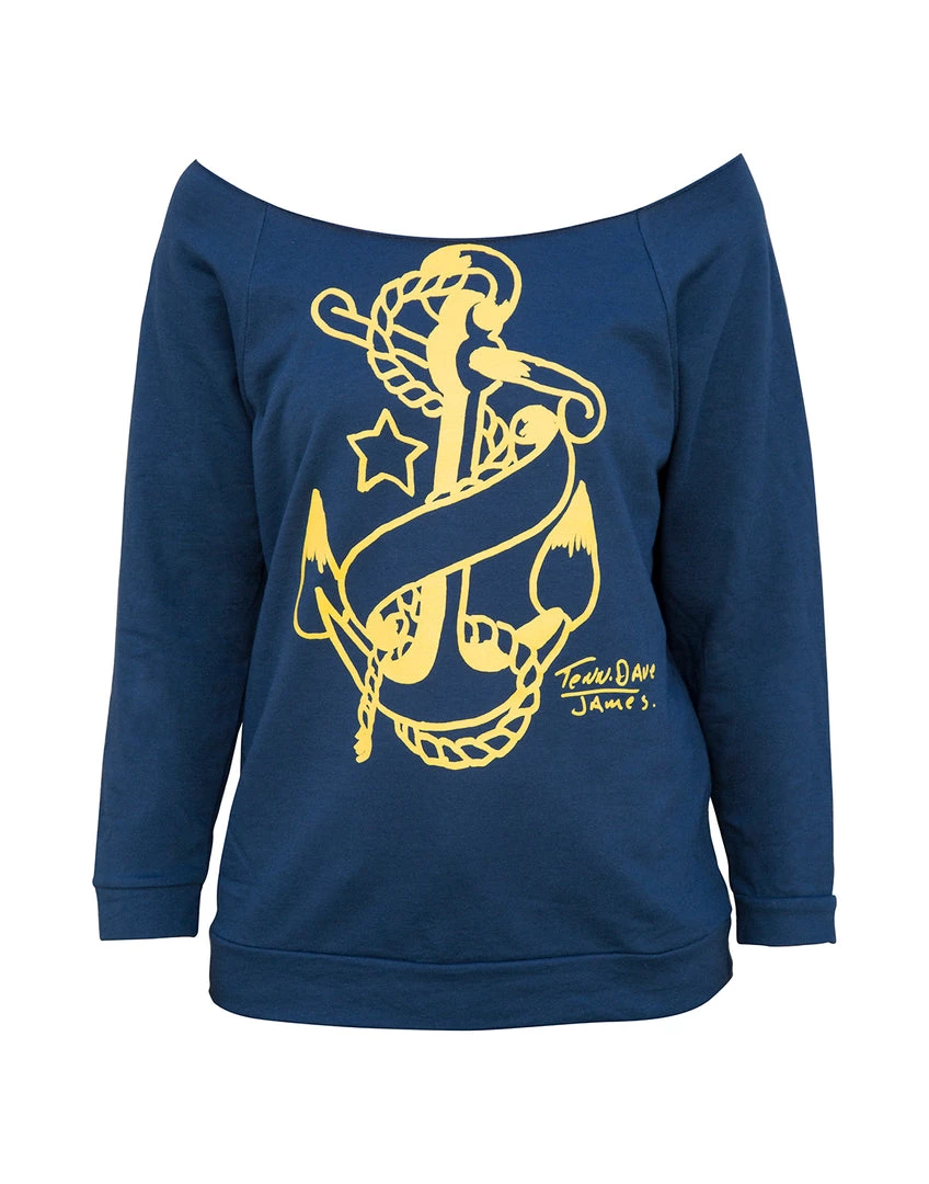 Ahoy Babe! Sail the seas (or just hang out in the comfort of your home) in this comfy & cute raw edge sweatshirt. Featuring a classic nautical anchor, on navy blue cotton.