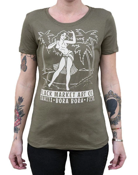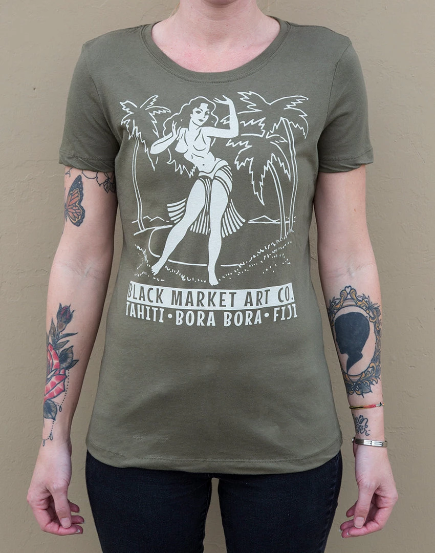 Feel like the babe you are in this adorable tee featuring a classic hula girl ready to shake her stuff! White ink, on a military green fitted tee