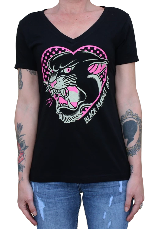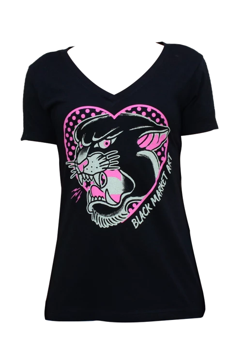 Cute Shirt Alert! Featuring a pink panther tattoo flash style heart design on a comfy cotton V-neck tee shirt