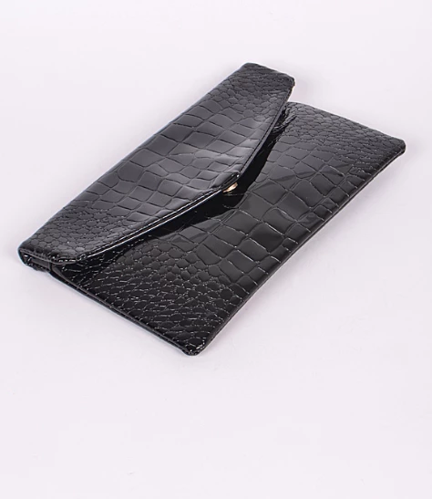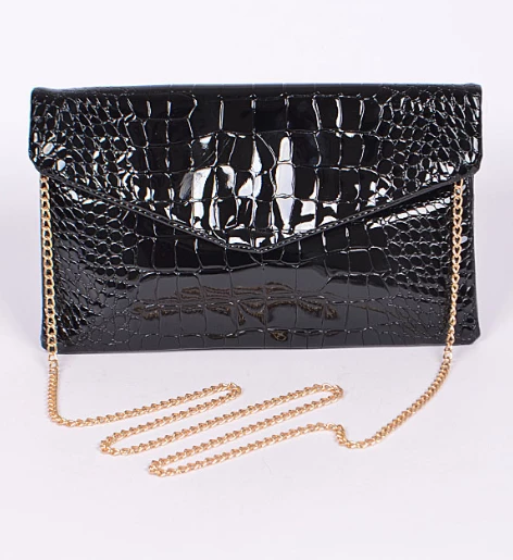 A classic envelope clutch in a shiny, sexy, faux croc print! This black clutch style bag features a hidden magnetic closure, and 1 zipper inside pocket. Also includes a detachable gold chain for converting, to be worn on the shoulder.Â