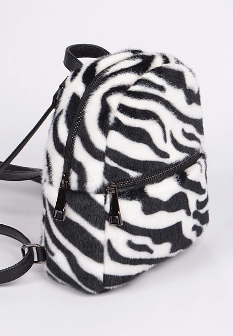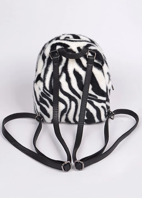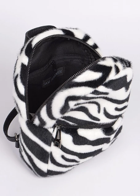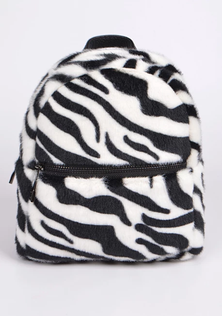 For the Fuzzy Bby. super cute mini back pack featuring all over fuzzy (faux fur) zebra print. Double pockets & black details.