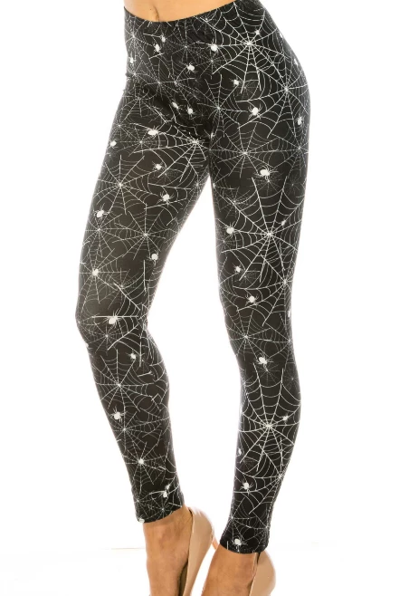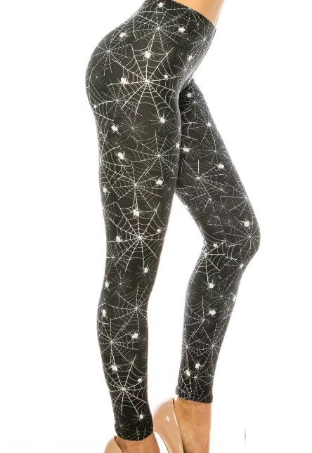 Check out these spooky cute new leggings! For all the arachnid lovers out there, these are going to feel like silky soft webs on your legs! Black with all white spiders & web print, and a buttery soft fabric.