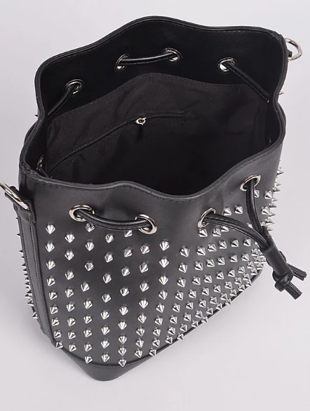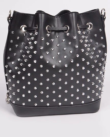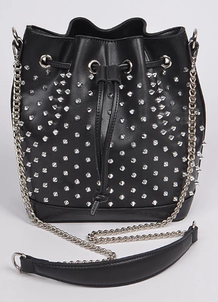 The perfect bucket! Draw string top, and a chain strap (detachable) – all over silver spikey studded detail – a KILLER bag!