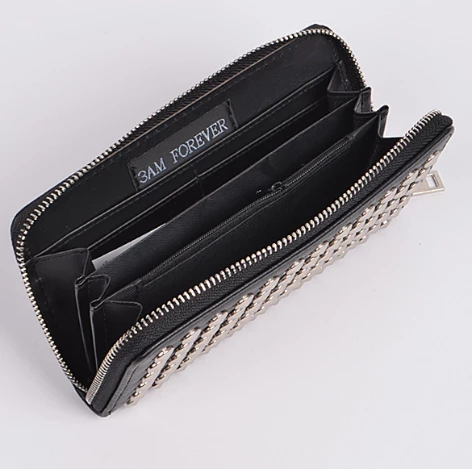 For the stud lovin’ babe! This clutch wallet features a zip around closure ,opens accordion style inside zipper pocket, plenty of card slots, and pockets to stash your cash – plus a chain wristlet for ease of carrying.