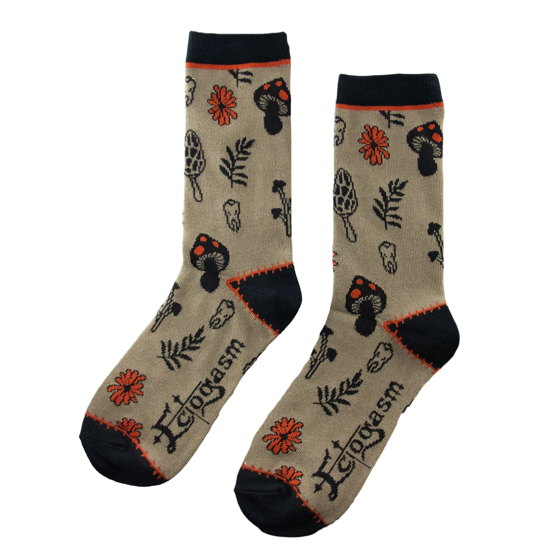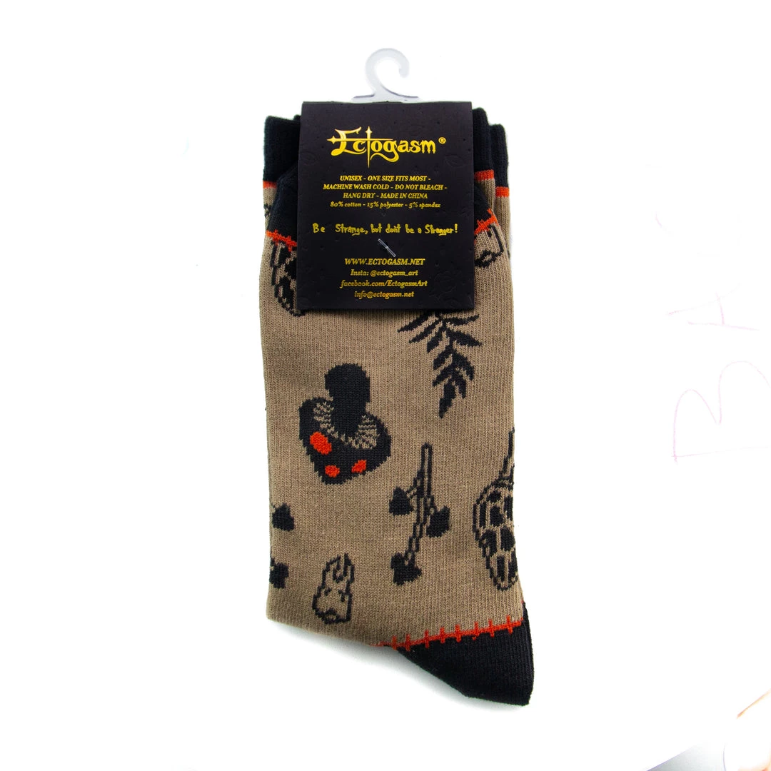 These subtly spooky socks feature a pattern of mushrooms, leaves, and orange flowers with human teeth hidden among them. Inspired by what mysteries the forest floor might keep, these unique socks make a great gift for true crime junkies.Â
