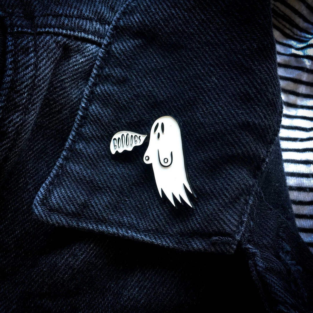 This enamel pin makes a funny addition to any spooky pin collection. It features a big breasted ghost with a speech bubble that says, “Boooobs”. This quirky fashion accessory is sure to bring a laugh. Made from black plated metal with white enamel fill. A metal clasp on the back locks this pin in place. Ideal for alternative and nu goth fashion.