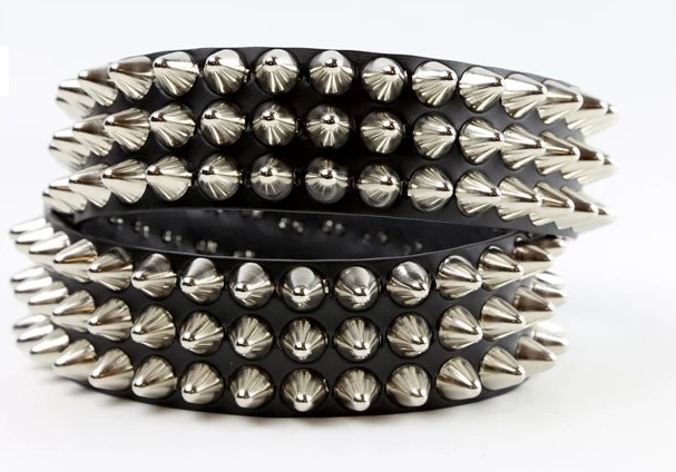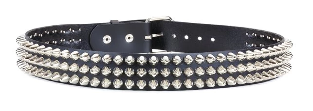 Three rows of silver/chrome tall British style cone studs with a buckle closure & real, genuine black leather.