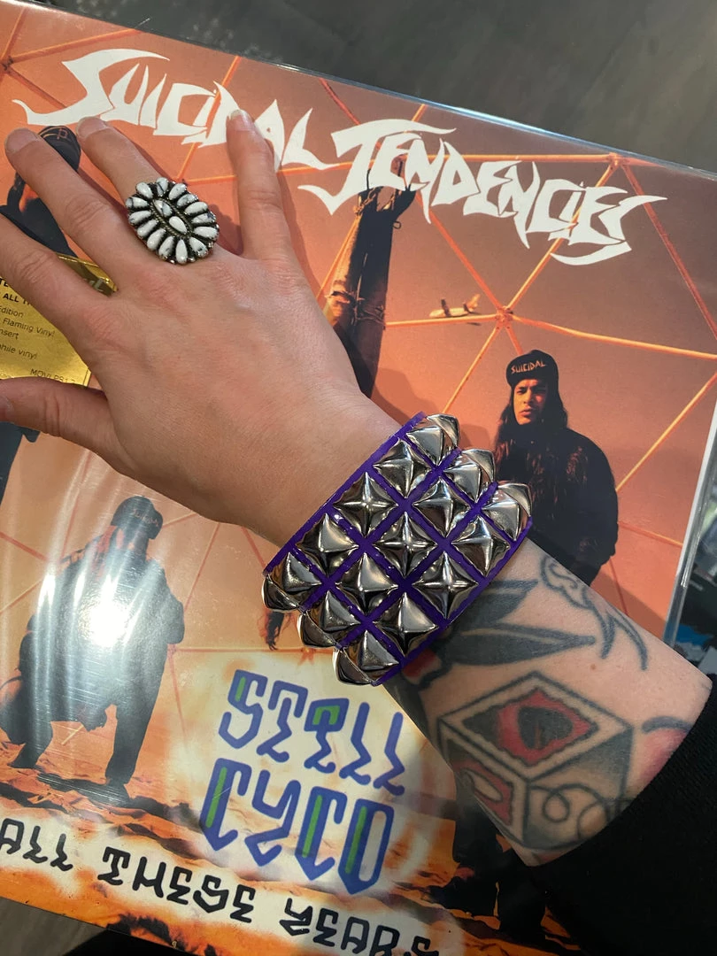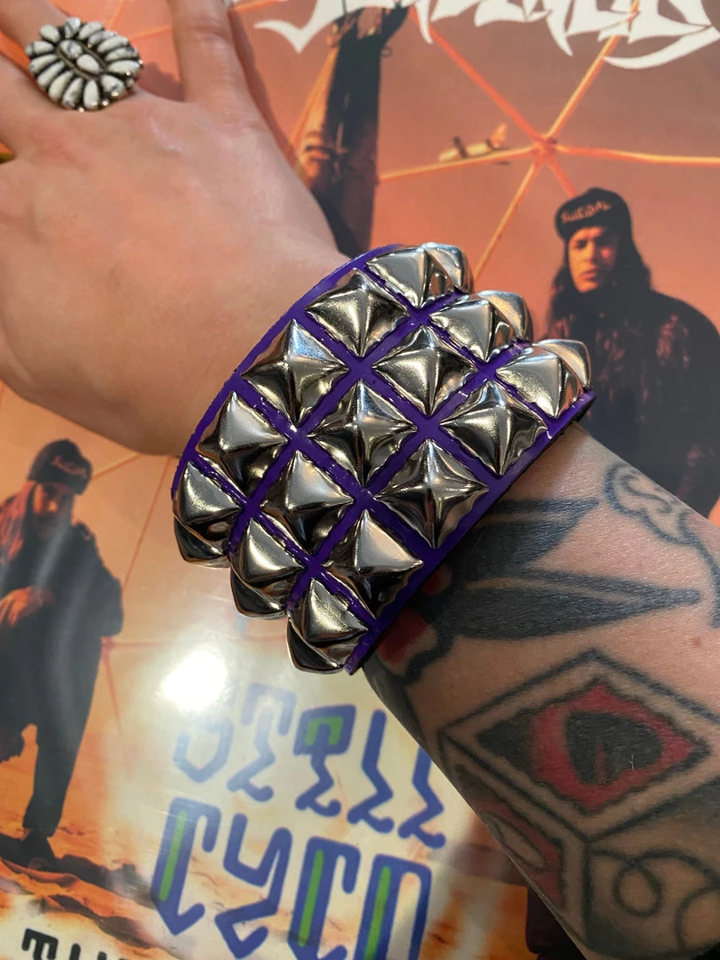 Three row bright purple, pyramid studded wristband with bright nickel 1/2″ pyramids. 1.75″ wide.
