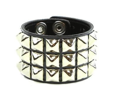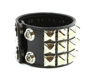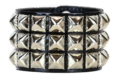 Three row shiny black patent leather, pyramid studded wristband with bright nickel 1/2″ pyramids. 1.75″ wide.