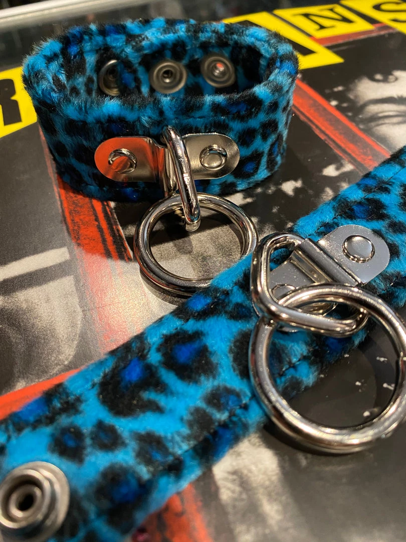 Fuzzy blue leopard print band with single bondage ring & a, adjustable double snap closure. 5/8″ wide band with 1″ ring