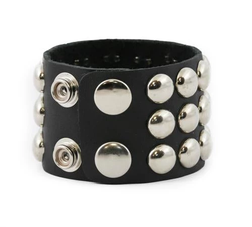 This rad leather wristband features three rows of round, spot studs & a snap closure