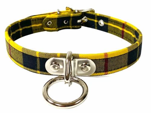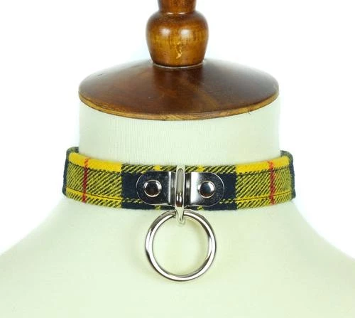 This choker features yellow plaid (3/4″ wide) & a single 1″ bondage ring in the center. (Different Colors Available too!)