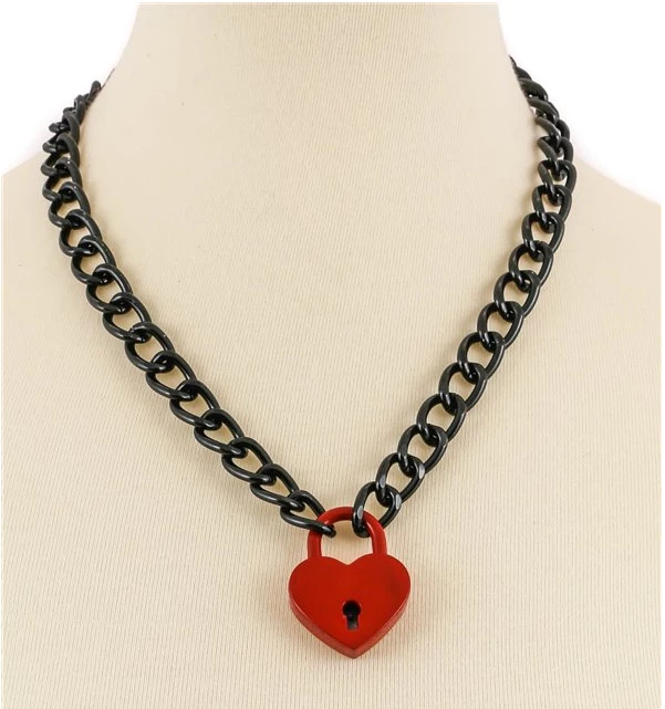 “I found the keys keys, Yeah the keys to your heart heart, Yes I got them on a chain chain….” Shiny Red Heart lock with Black Chain Necklace. Heart lock opens & closes to get on. Includes Black Heart shaped key!