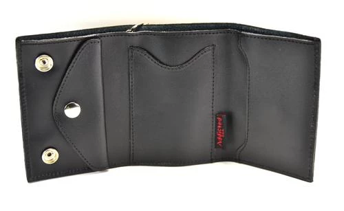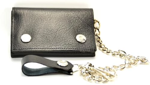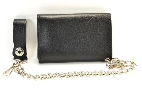 Stash your cash with this tri- fold chain wallet featuring a black leather exterior & a snap closure. Holds all the essentials!
