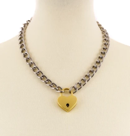 “I found the keys keys, Yeah the keys to your heart heart, Yes I got them on a chain chain….” Shiny Silvery Chain with Gold Heart Lock Necklace. Heart Lock opens & closes to get on.Â