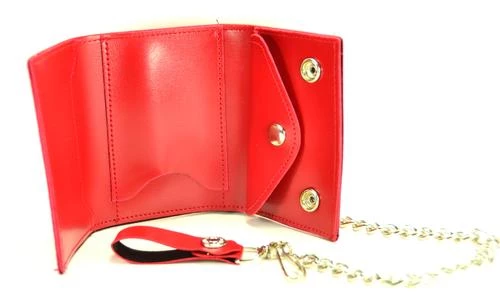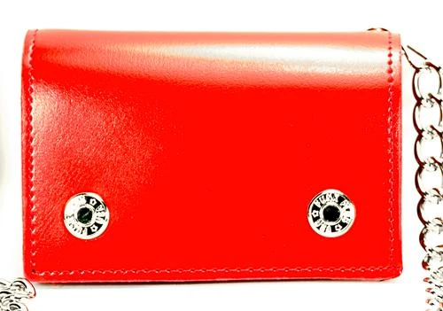 Stash your cash with this tri- fold chain wallet featuring a bright red leather exterior & a snap closure. Holds all the essentials!
