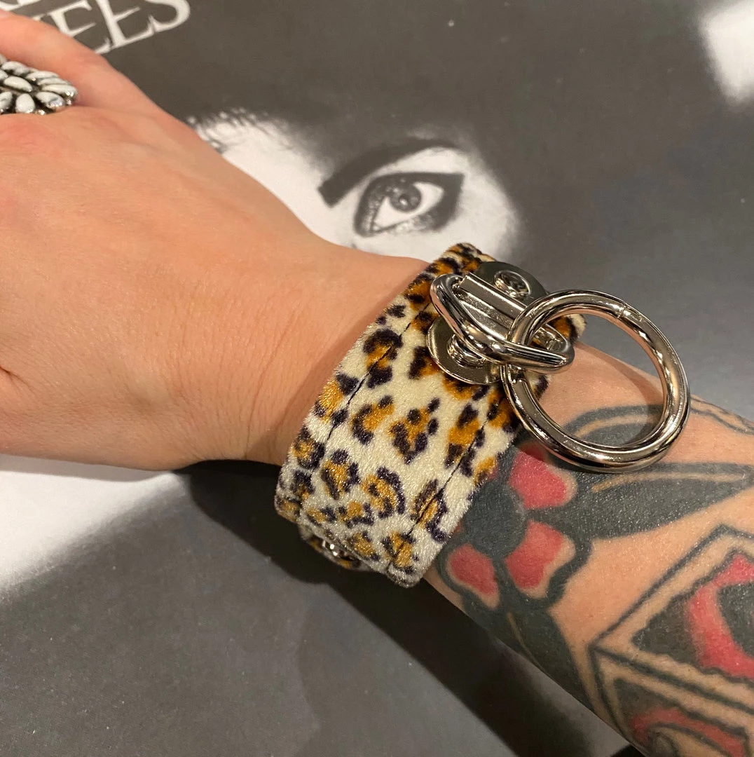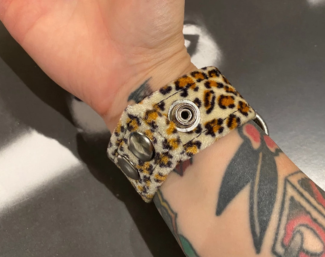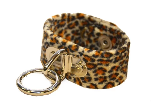 Fuzzy leopard print band with single bondage ring & a, adjustable double snap closure. 5/8″ wide band with 1″ ring