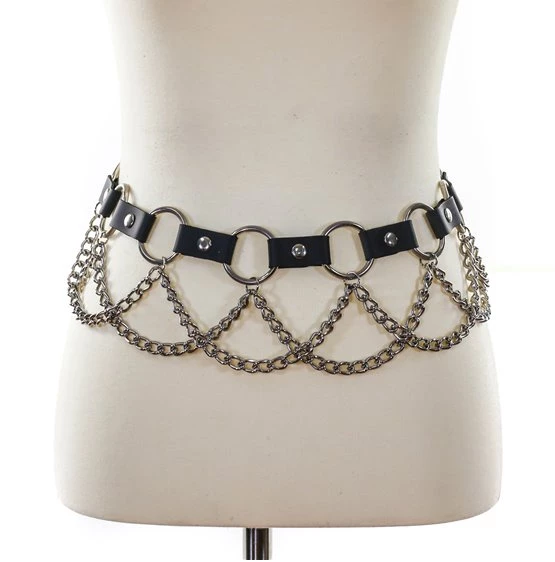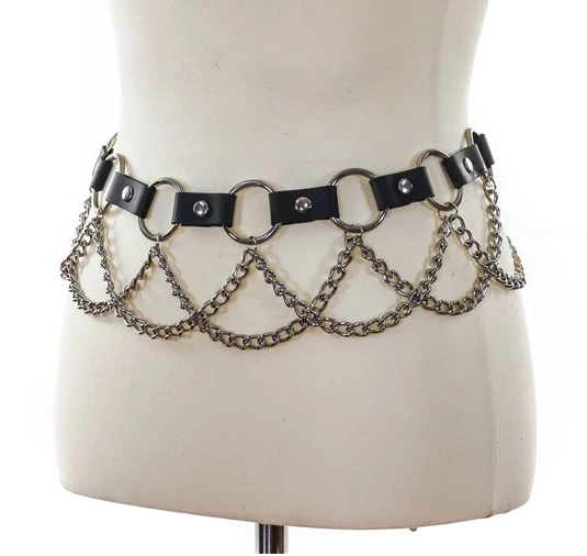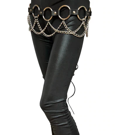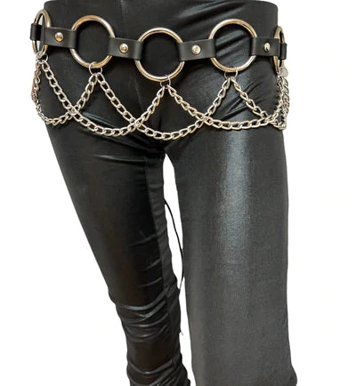 High Quality Leather Belt featuring mid-sized, linked, shiny silver (plated) rings with chains in bewtween. Pure rock n roll, killer with leggings or your favorite mini skirt. MeOw.
