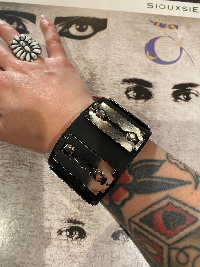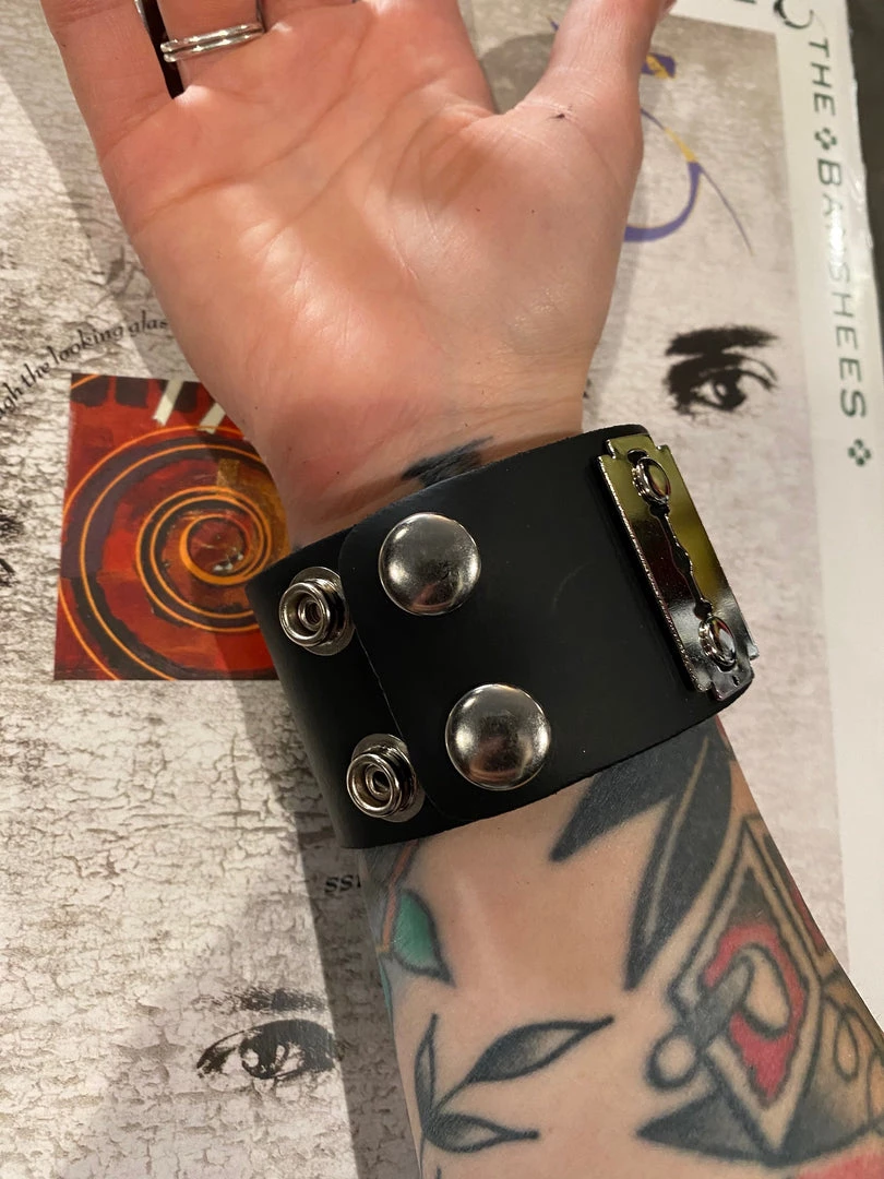 Razor Blade Hardware on a Black Leather Wristband with snap closure.