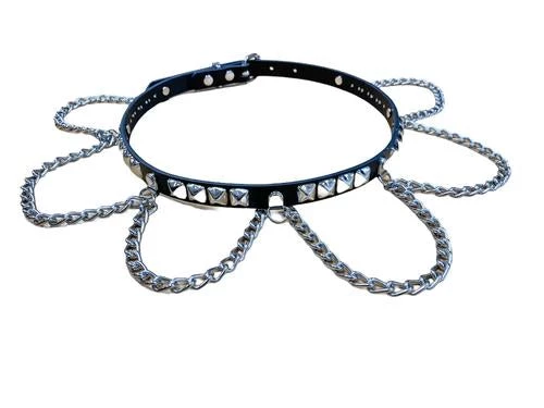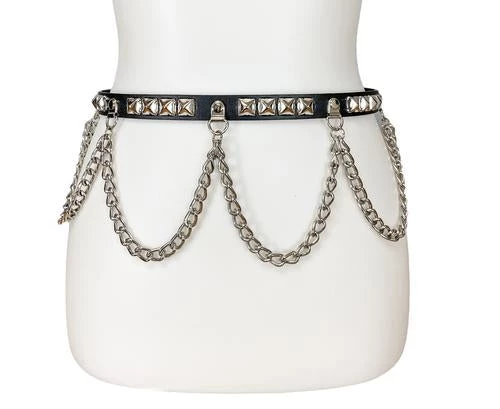 High Quality Leather Belt featuring a single row of pyramid studs with chains in between. Pure rock n roll, killer with leggings or your favorite mini skirt. MeOw.