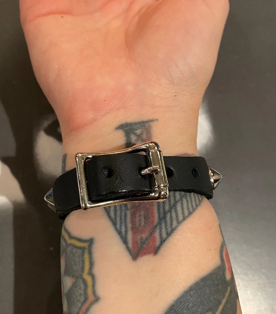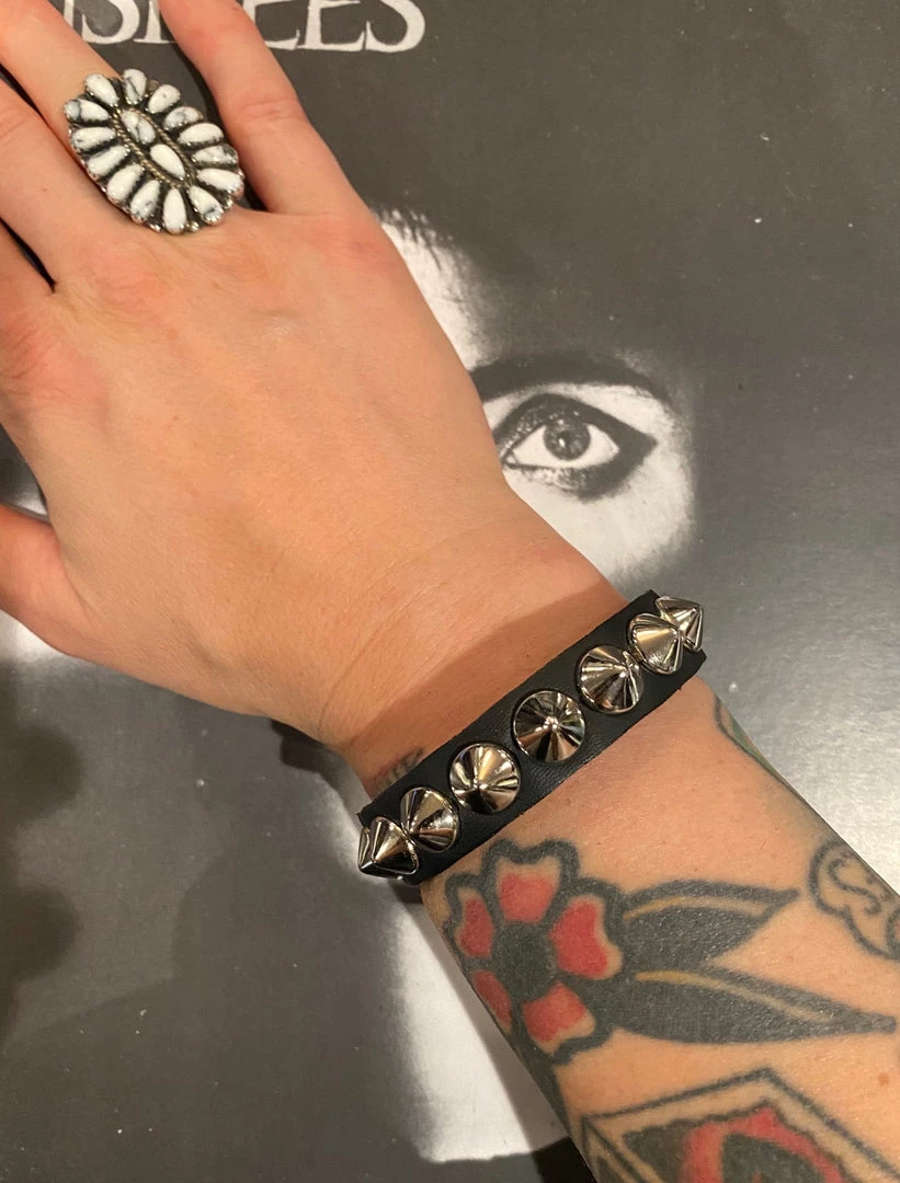 Single Row of Cone Studs on a Black Leather Wristband with buckle style closure.