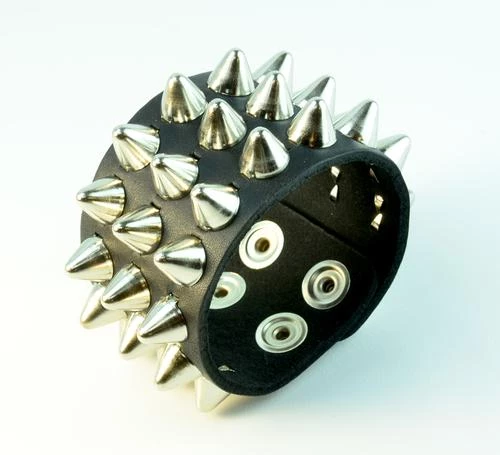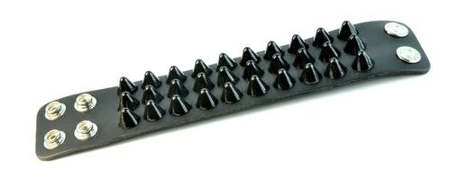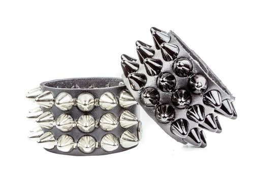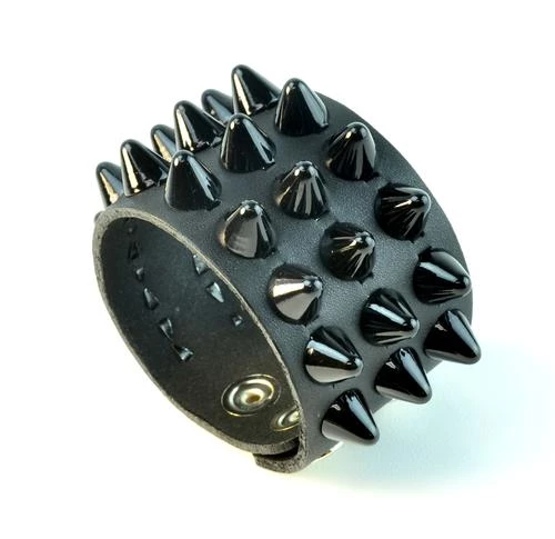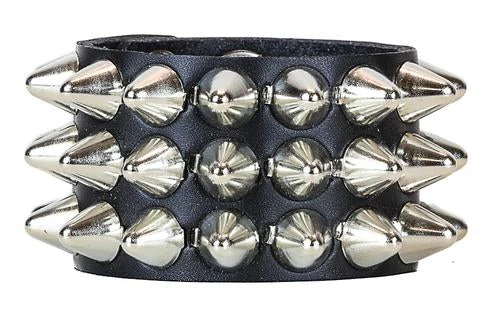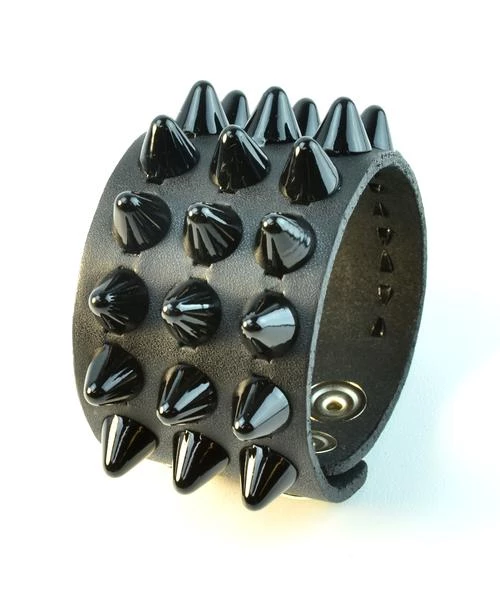Three Row Tall British Cone Studs on a Black Leather Wristband with snap closure.