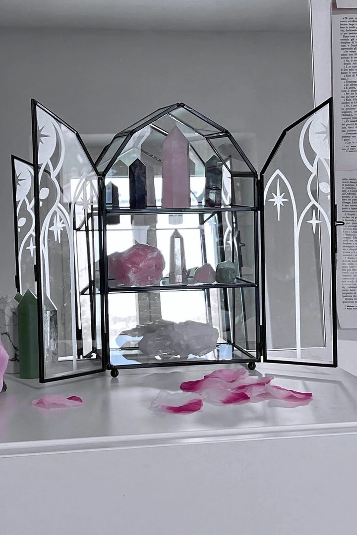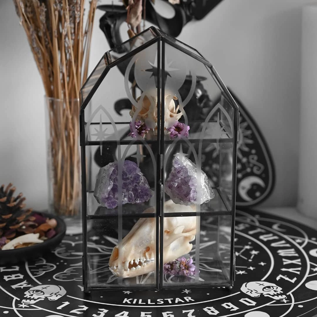 Home sweet haunted home. Add a bit of spooky to your crypt with our ‘Cathedral’ display case – complete with double glass lids. Perfect for storing crystals, knick-knacks, keys, secret stuff or whateverz!