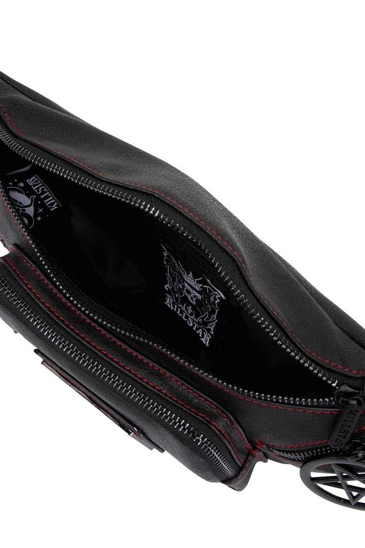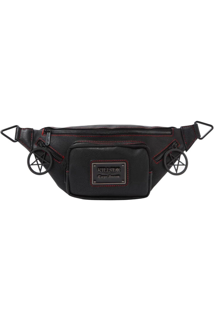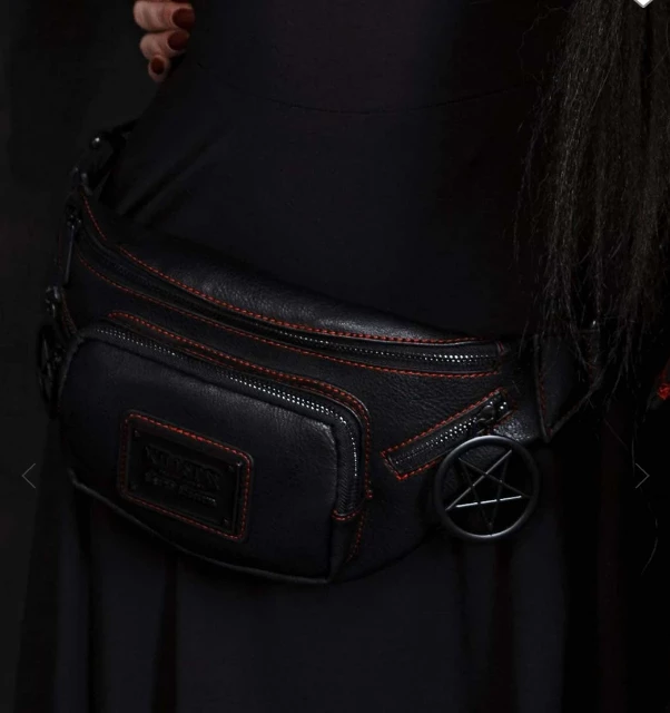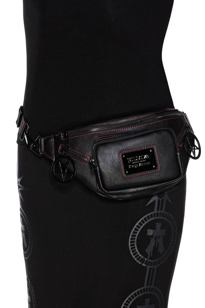 The perfect grab-n-go grunge accessory, our “Demonizer” waist bag has been conjured with a faux leather shell and zip closure. Features contrast stitching and pentagram hardware, the handiest bag for a ghoul on the go.