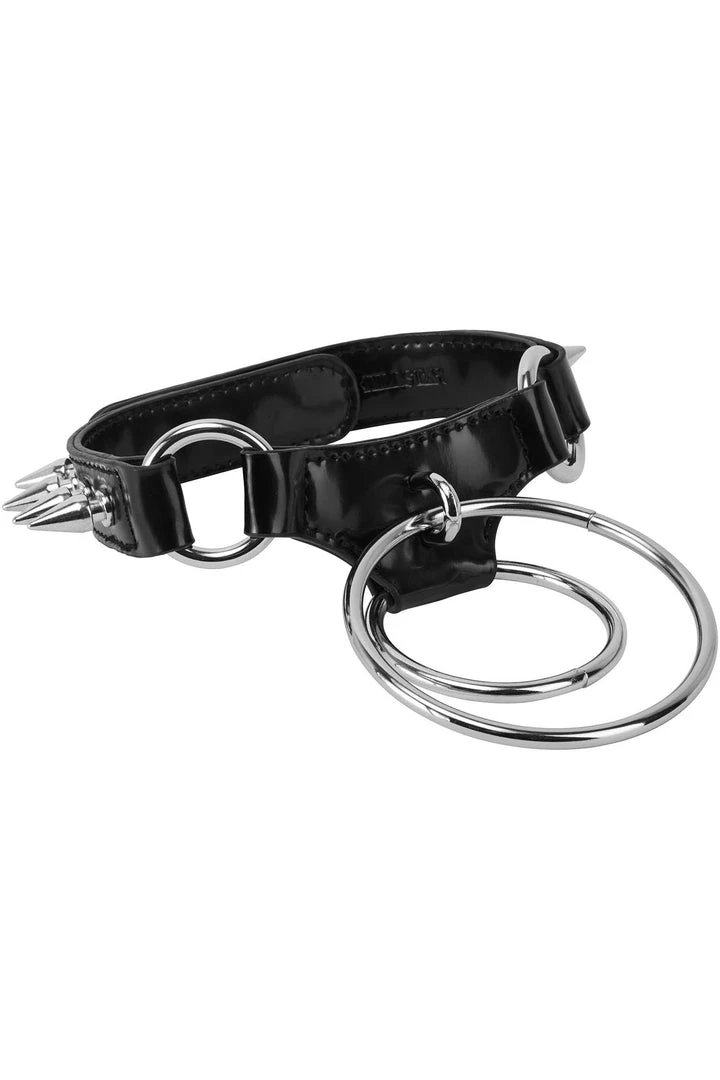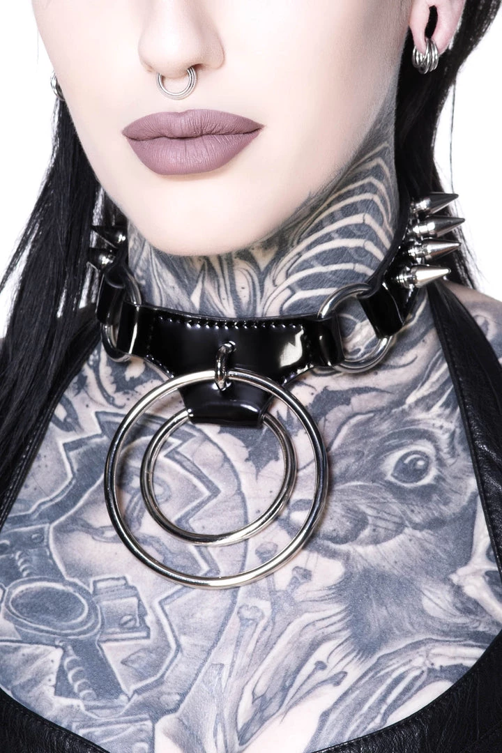 Add a touch of angst to yer day-to-day with the ‘Devil Doll’ choker. Faux-leather with a patent finish, mix spike formation and double o-ring detail. Adjustable back for a perfect fit!