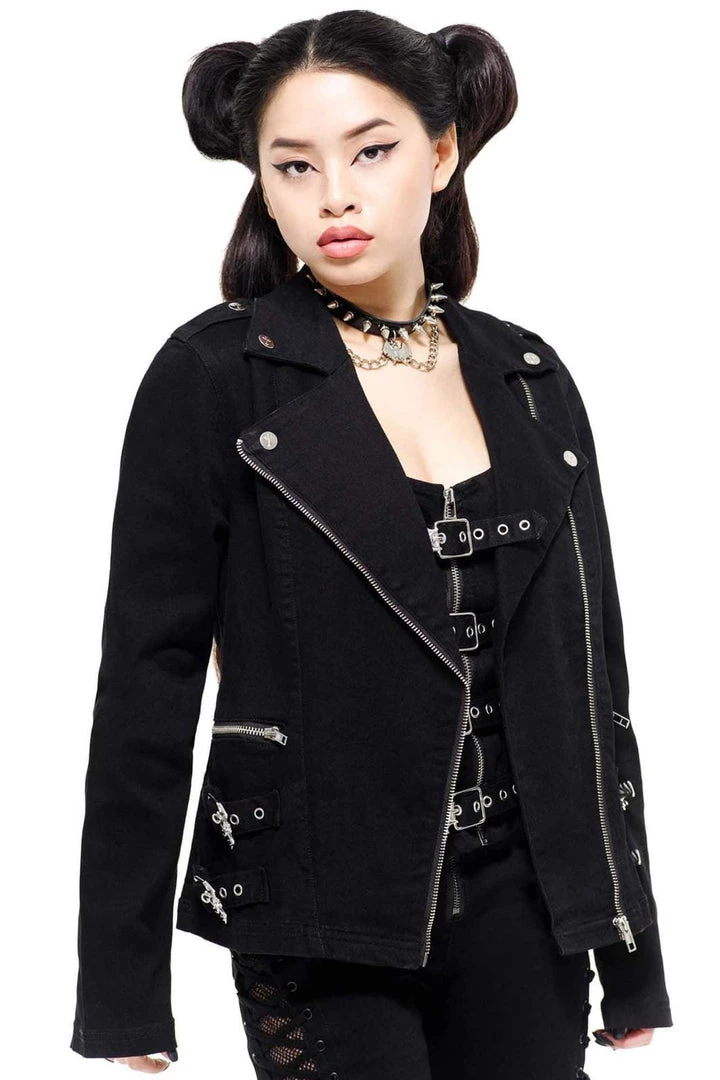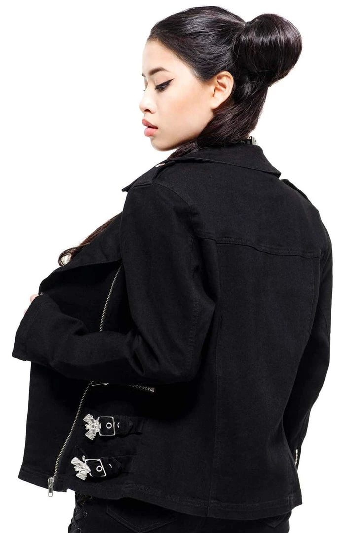 Look the gothic part in the ‘Endless Sleep’ biker jacket, with statement bat buckles and zip front + pockets – a simple style that fits in with everything. Made using a stretch denim for a comfortable fit! Super practical + versatile – looks great dress up or down!