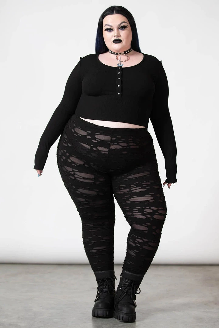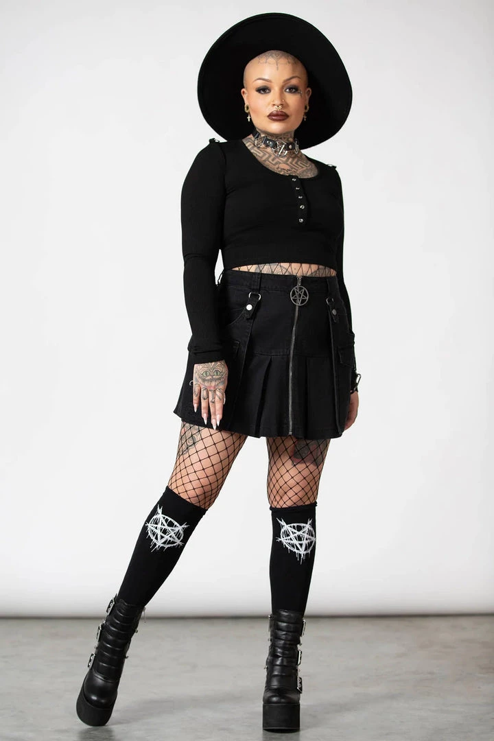 Model with tattooed head is 5ft 7 and wears a size M, Model with green hair is 5ft 6 and wears a size M. KILLSTAR branding, 93% Rayon, 7% Elastane.