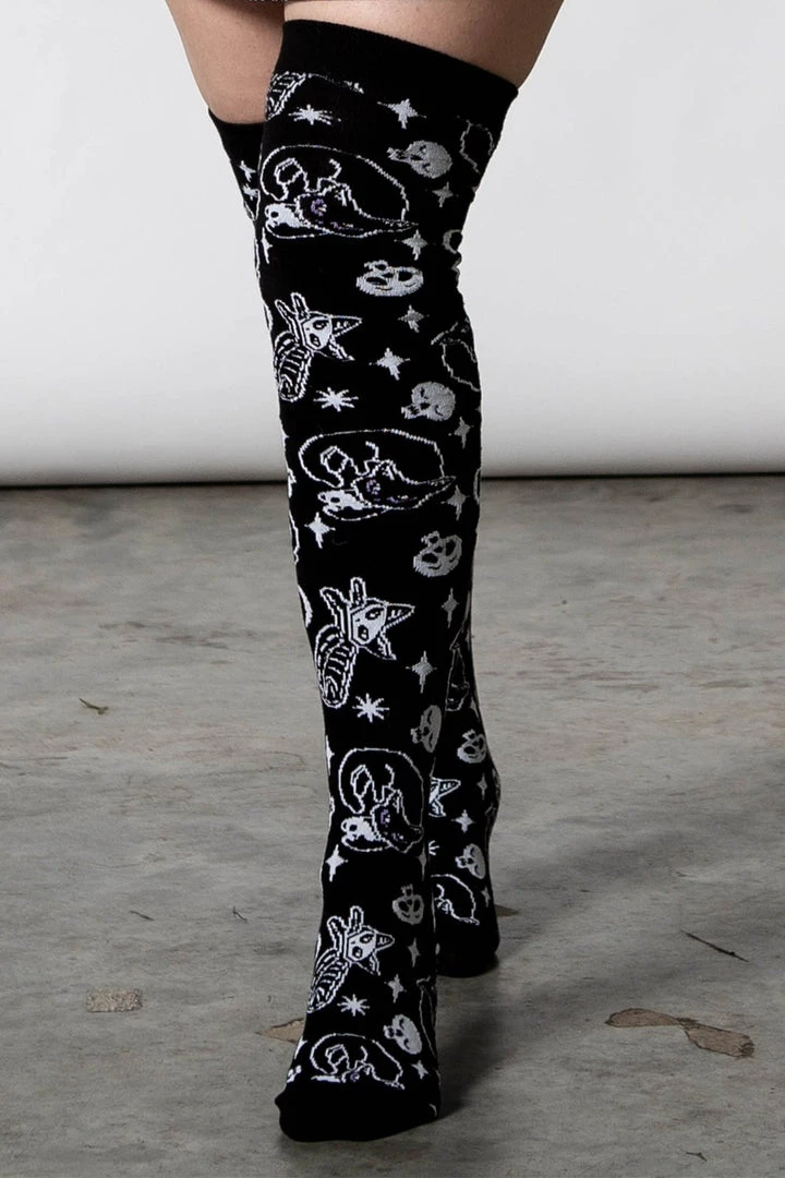 Spooky soulmates live on forever. Super cute stockings with contrasting graphic print; purrfect for your black-on-black wardrobe.