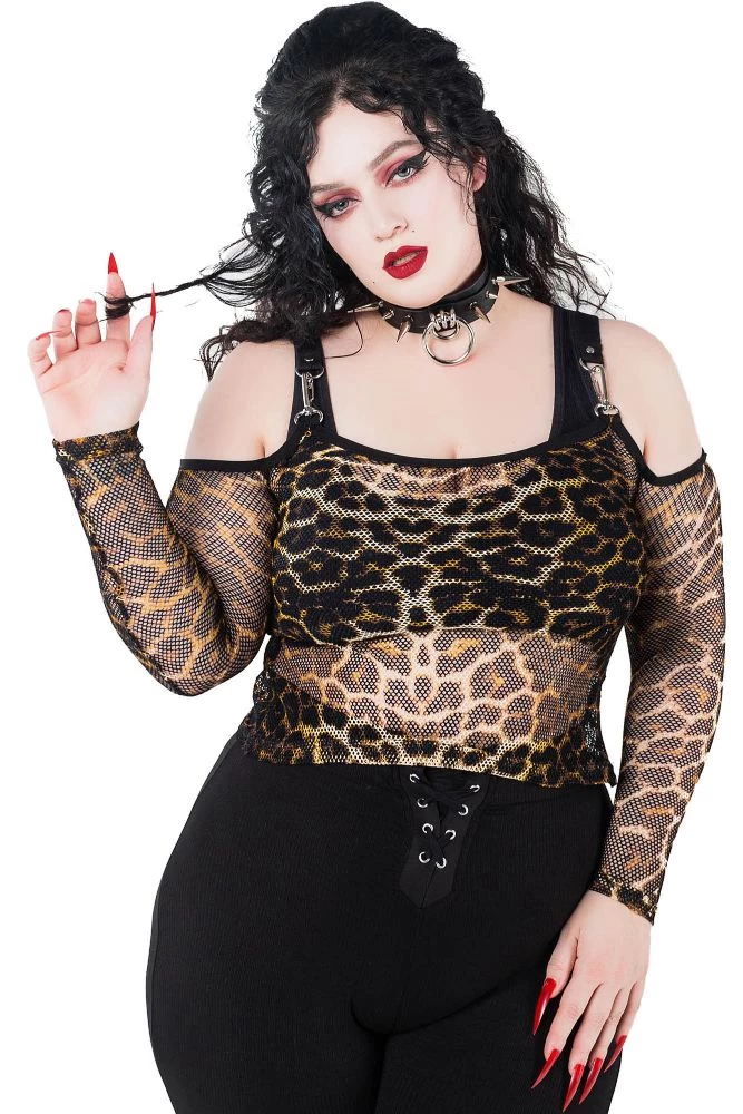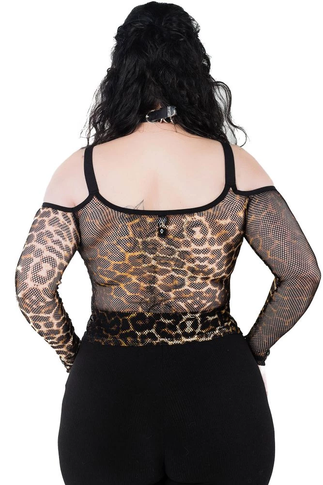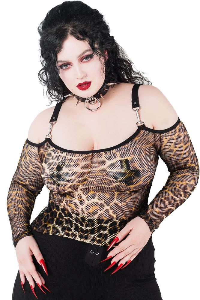 Turn heads in the ‘Overkill’ fishnet top; made using a stretch fishnet which stretches to perfection for a body huggin’ fit. Complete with round neckline, cold shoulder detail and long sleeves. The perfect lil’ top for completing yer fav dark looks with some extra attitude – looks great from Dusk to Dawn!