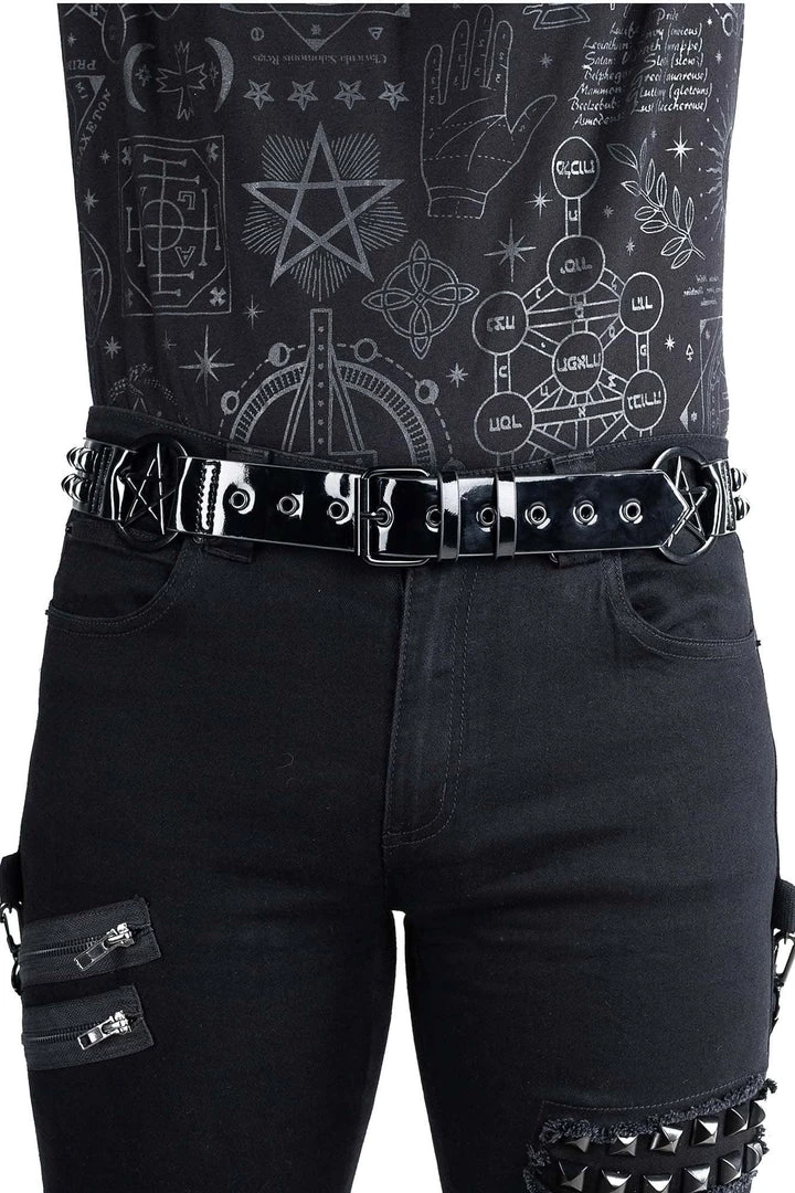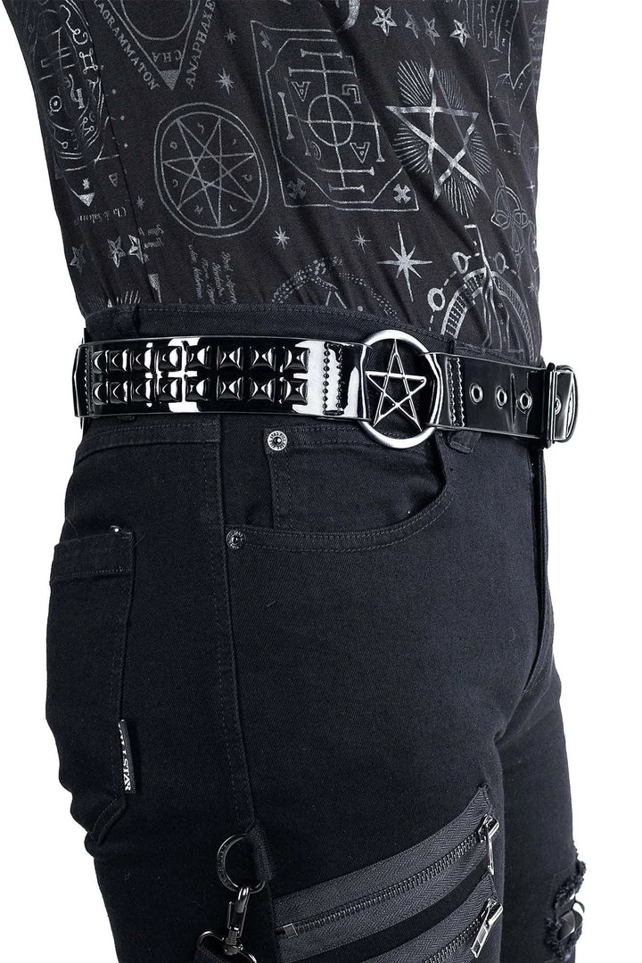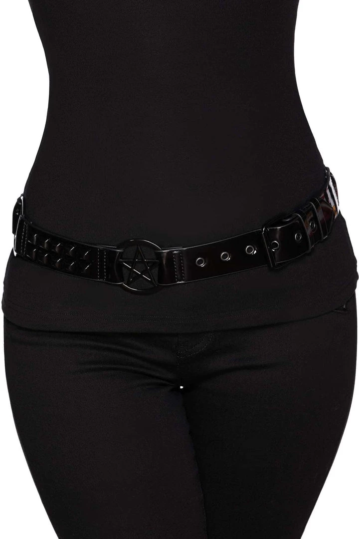 Get ready to cause some trouble; faux-leather belt featuring pentagram details and silver hardware. Looks seriously killer on bodycon dresses or fishnet!