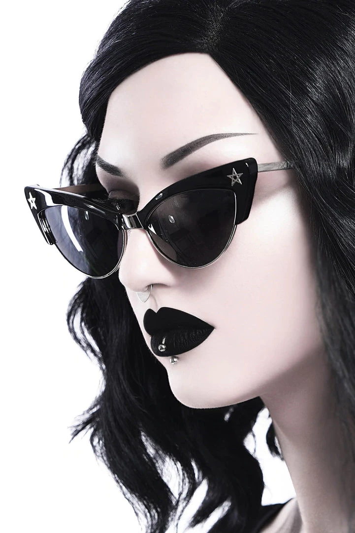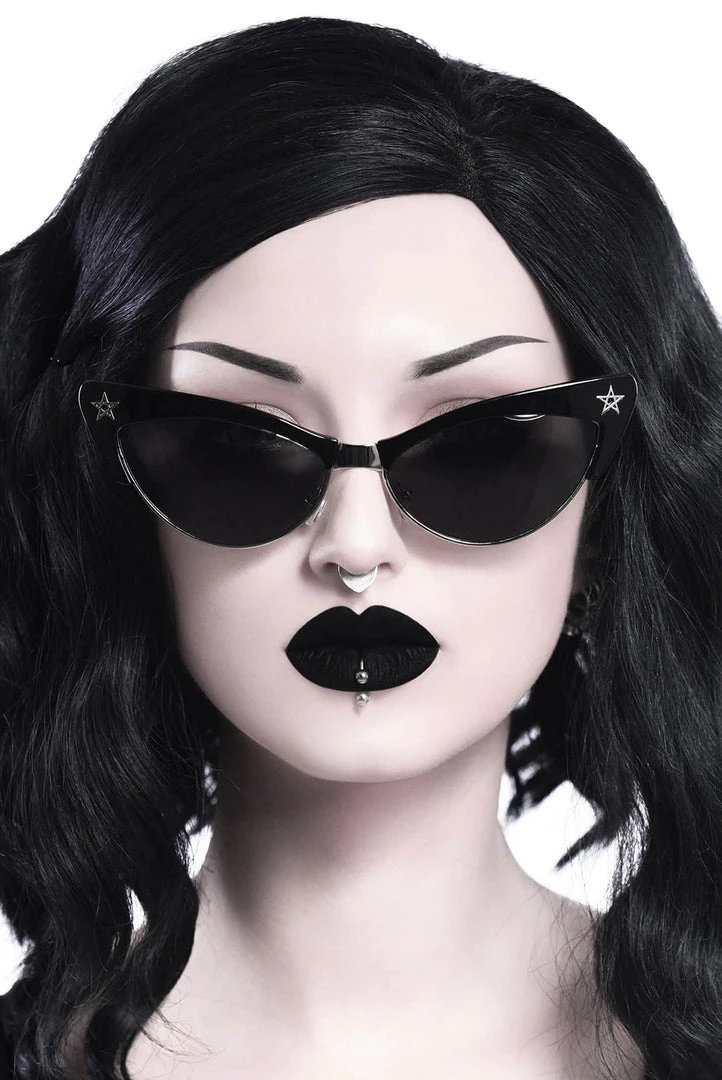 Add a touch of evil with our ‘Drucilla’ sunglasses. Perfectly sized cat-eye silver frames with contrasting black tops and pentagram hardware detailing. With black tinted lenses, of course. UV protection.