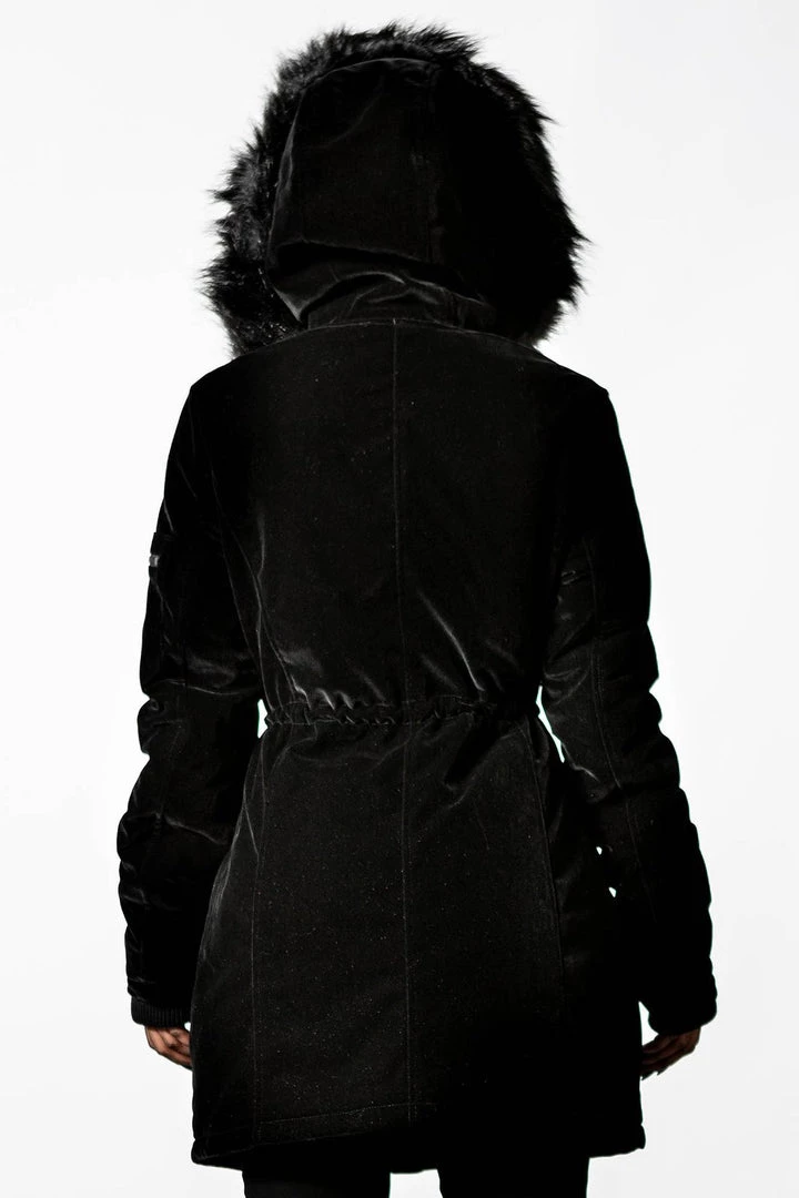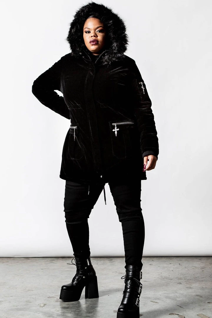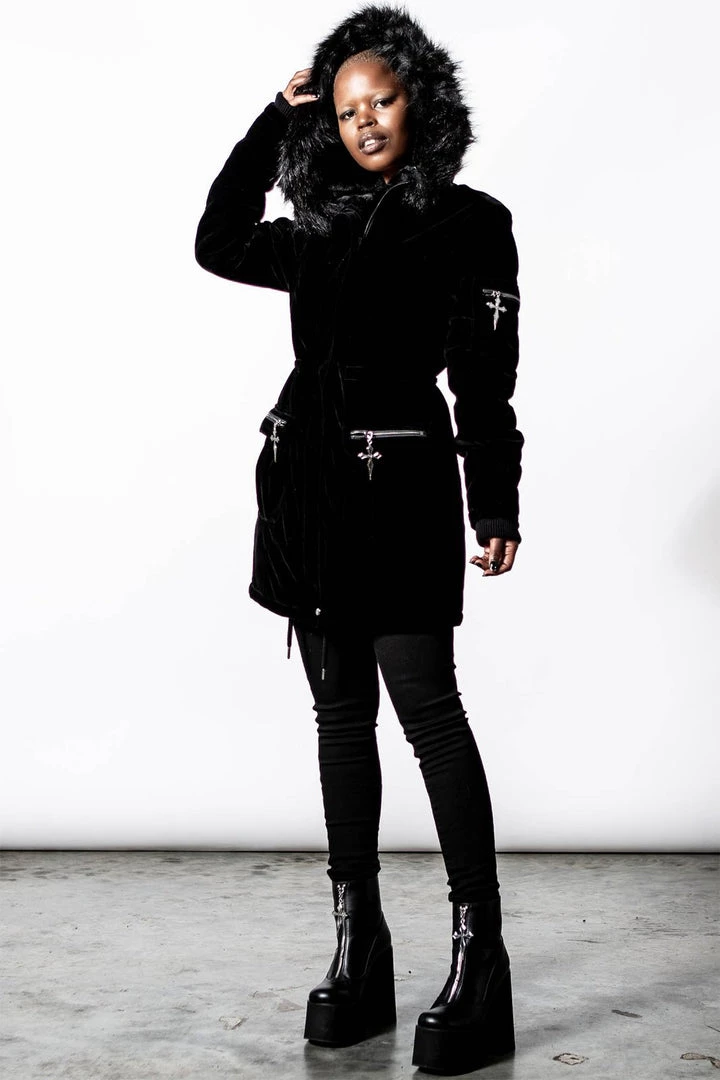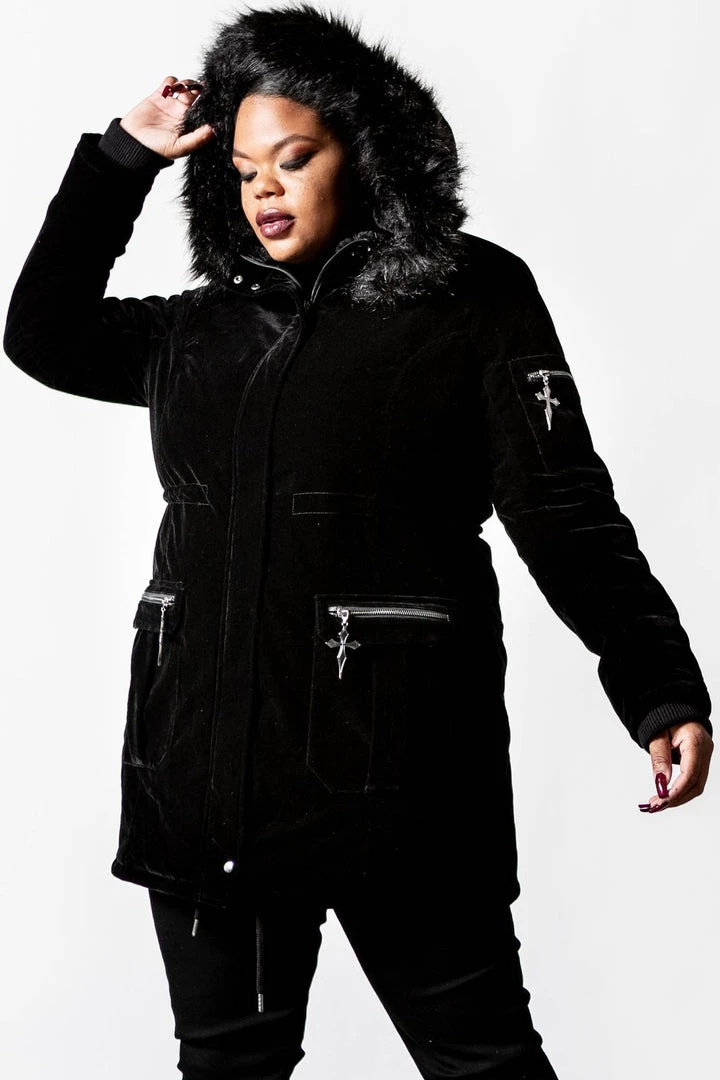 Turn up the temperature in our ‘Stormy Daze’ parka jacket. Made from a soft touch velvet and lined for extra comfort. It features an oversized hood, faux fur detail and silver cross hardware. Big pockets to keep all your essentials! This is a must-have statement coat that any goth can rock!