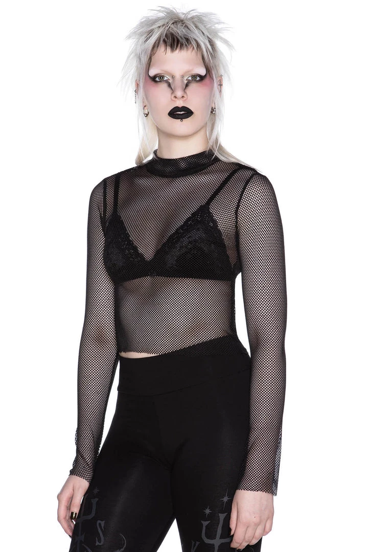 Who said basic had to be boring? Turn heads in the ‘Unruly’ crop top; made using a stretch fishnet which stretches to perfection for a body huggin’ fit. Complete with high neckline and long sleeves. The perfect lil’ crop for completing yer fav dark looks with some extra attitude – looks great from Dusk to Dawn!